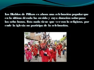 Los Diablos de Píllaro es una celebración popular ecuatoriana que dura más de ocho horas, durante la cual los participantes usan trajes y máscaras diabólicas. La celebración ya no tiene un enfoque religioso, por lo que la iglesia no participa.