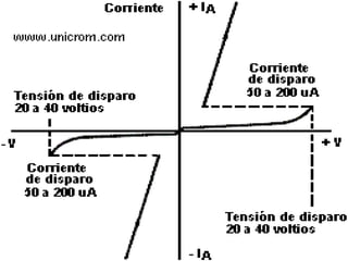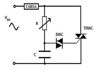 El DIAC es un dispositivo electrónico bidireccional construido con silicio dopado con aluminio que se usa para controlar la fase de la corriente en un triac, permitiendo aplicar tensión a una carga solo durante una fracción del ciclo alterno. Esto permite controlar la intensidad de iluminación, regular la temperatura en calefacción eléctrica y controlar la velocidad de motores.