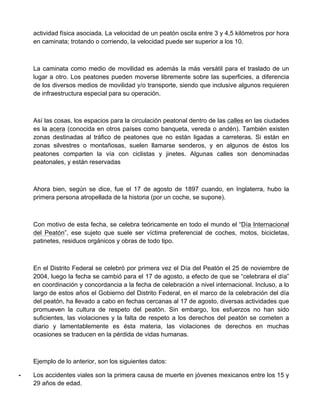 La diputada Laura Ballesteros Mancilla presenta una proposición para promover los derechos del peatón en el marco del día internacional del peatón, instando a todas las dependencias y órganos del gobierno del distrito federal a fomentar la movilidad peatonal. Se citan estadísticas preocupantes sobre accidentes de tránsito y la vulnerabilidad de los peatones, especialmente jóvenes y adultos mayores, resaltando la necesidad de mejorar la educación vial y la infraestructura. La propuesta busca reafirmar el compromiso de la ciudad con el respeto a los peatones y la reducción de atropellamientos.