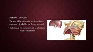 El diafragma es un músculo ancho y aplanado con forma de cúpula que se encuentra en la abertura inferior del tórax. Presenta inserciones musculares en la columna vertebral, las costillas y el esternón, así como orificios para permitir el paso de estructuras como la vena cava inferior y el esófago. Actúa como el principal músculo inspirador al contraerse y elevar las costillas durante la inhalación, creando espacio para los pulmones.