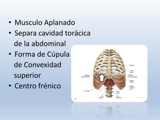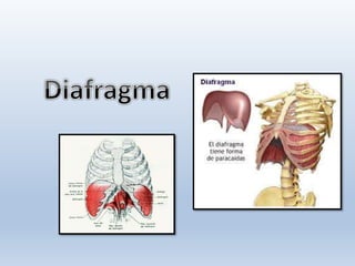 El diáfragma es un músculo aplanado que separa la cavidad torácica de la abdominal. Está formado por tres porciones - lumbar, costal y esternal - y contiene varios hiatos y forámenes por los que pasan estructuras como la aorta, la vena cava inferior y el esófago. Al contraerse, el diafragma aplana y aumenta la presión en la cavidad torácica para permitir la inspiración.