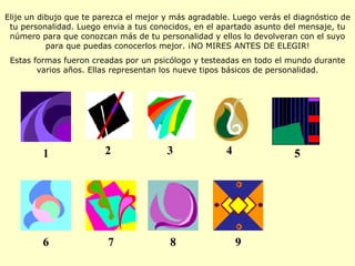 Este documento presenta nueve tipos de personalidad representados por diferentes formas geométricas. Sugiere elegir una forma y luego recibirá una descripción de su personalidad. También invita a compartir el número de la forma elegida con conocidos para conocer mejor sus personalidades.