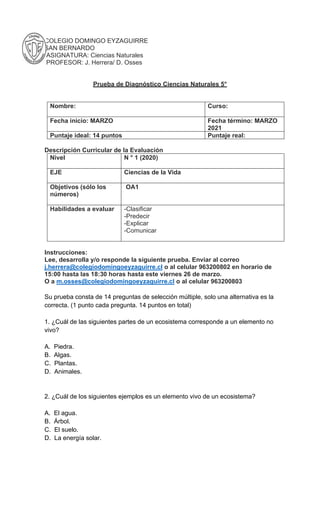 Este documento presenta una prueba de diagnóstico de Ciencias Naturales para 5° básico sobre ecosistemas. Consta de 14 preguntas de selección múltiple sobre conceptos como elementos bióticos y abióticos, cadenas tróficas, adaptaciones de organismos y experimentos sobre la adaptación de plantas a la escasez de agua. Los estudiantes deben responder las preguntas y enviarlas por correo electrónico o mensaje de texto al profesor antes de una fecha límite.