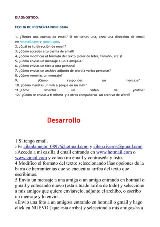 Este documento presenta una serie de preguntas sobre el uso básico del correo electrónico y cómo realizar tareas comunes como enviar y recibir mensajes, archivos adjuntos, fotos y videos. El resumen proporciona detalles sobre cómo acceder a una cuenta de correo electrónico, enviar un mensaje a otros, adjuntar archivos y responder o reenviar mensajes.