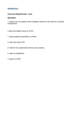 El documento proporciona preguntas sobre el diagnóstico de una persona sobre su experiencia trabajando en una sala de computación en 2010, incluyendo las actividades realizadas, los programas aprendidos y los componentes internos de una PC como el gabinete y el CPU.