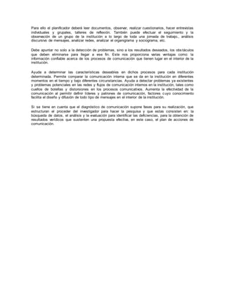 Este documento describe el diagnóstico de comunicación como un proceso para evaluar la eficacia de los sistemas de comunicación de una organización mediante el análisis de canales, emisores, contenidos e impacto. Existen dos tipos principales de diagnóstico: internos, que evalúan las relaciones de comunicación dentro de la organización, e externos, que evalúan las relaciones con otras instituciones y públicos. Un diagnóstico interno implica identificar actores clave, analizar percepciones, relaciones entre grupos, mensajes y flujos de