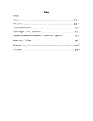El documento presenta información sobre un proyecto comunitario realizado en Venezuela. Incluye un diagnóstico comunitario que identificó problemas y necesidades de la comunidad a través de técnicas participativas. También describe la importancia de formar líderes comunitarios y desarrollar una comunicación efectiva, así como técnicas para resolver conflictos de manera pacífica. El objetivo final es mejorar las condiciones de vida de la comunidad a través de un proceso colectivo.