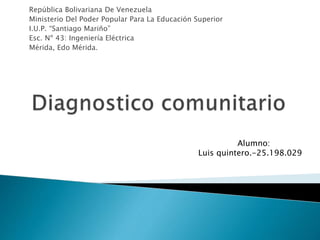 El documento identifica seis problemas en una comunidad: el mal estado del sistema eléctrico, el deterioro del asfaltado, la ausencia de embaulamiento, la basura en las calles, la inseguridad y las viviendas en mal estado. Propone soluciones como realizar mantenimiento al alumbrado y cableado eléctrico, bacheo y asfaltado con embaulamiento, limpiar la basura, pedir más presencia policial y reestructurar viviendas precarias con ayuda del gobierno local.