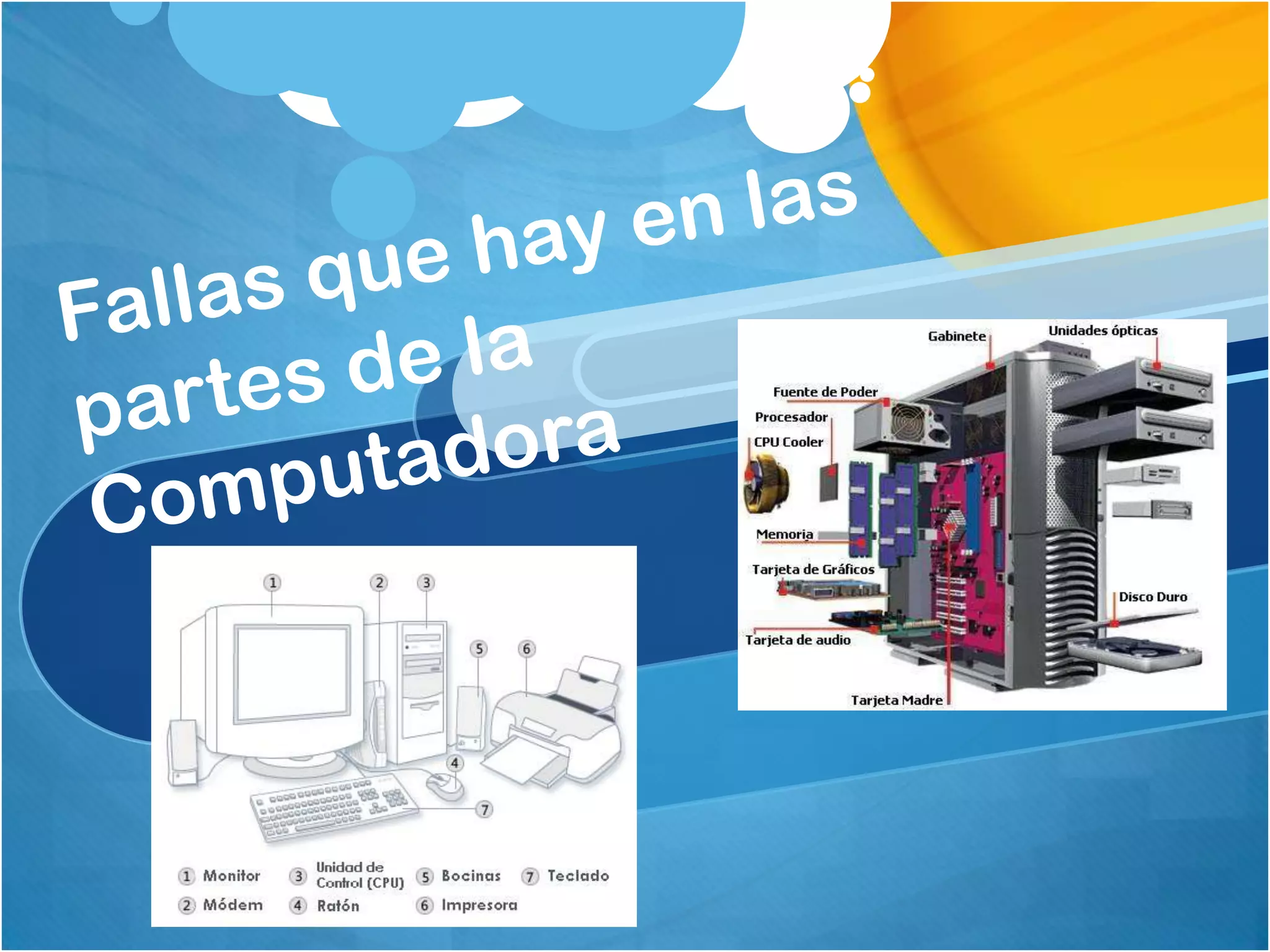 El documento describe varias fallas comunes en computadoras y sus posibles causas y soluciones. Las fallas más comunes en la fuente de poder se deben al recalentamiento por problemas con el ventilador de refrigeración. Otras fallas frecuentes incluyen errores de memoria RAM, fallas en la tarjeta de video, discos duros dañados y fallas en el microprocesador causadas por sobrecalentamiento. La mayoría de los problemas pueden diagnosticarse y resolverse revisando cables, reemplazando componentes dañados y ejecutando software de diagn