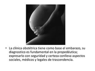 Este documento describe los diferentes signos y síntomas que se pueden usar para diagnosticar un embarazo, incluyendo signos de presunción como la ausencia de la menstruación, signos de probabilidad como el aumento del tamaño del útero, y signos de certeza como la detección del feto mediante ultrasonido. También explica cómo las pruebas de embarazo detectan la hormona hCG producida por la placenta para confirmar un embarazo de manera cuantitativa y cualitativa.