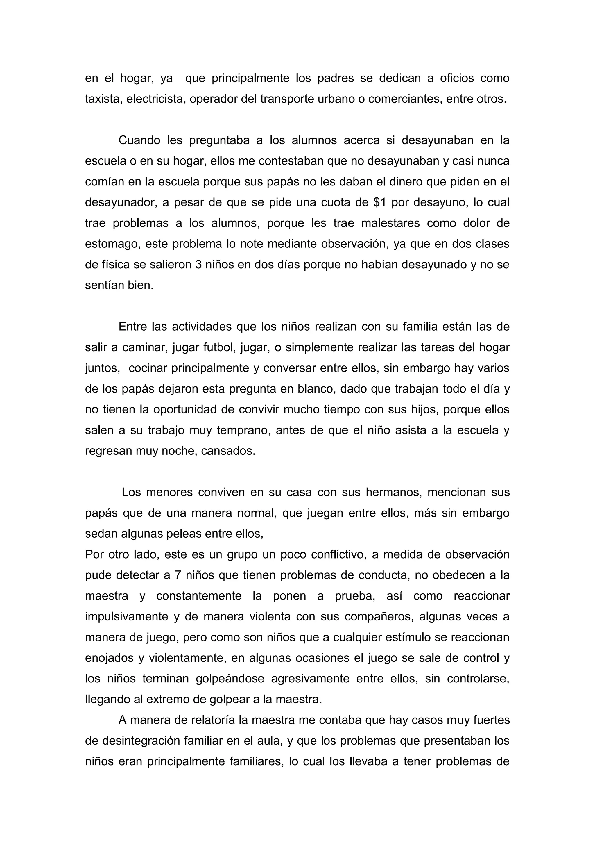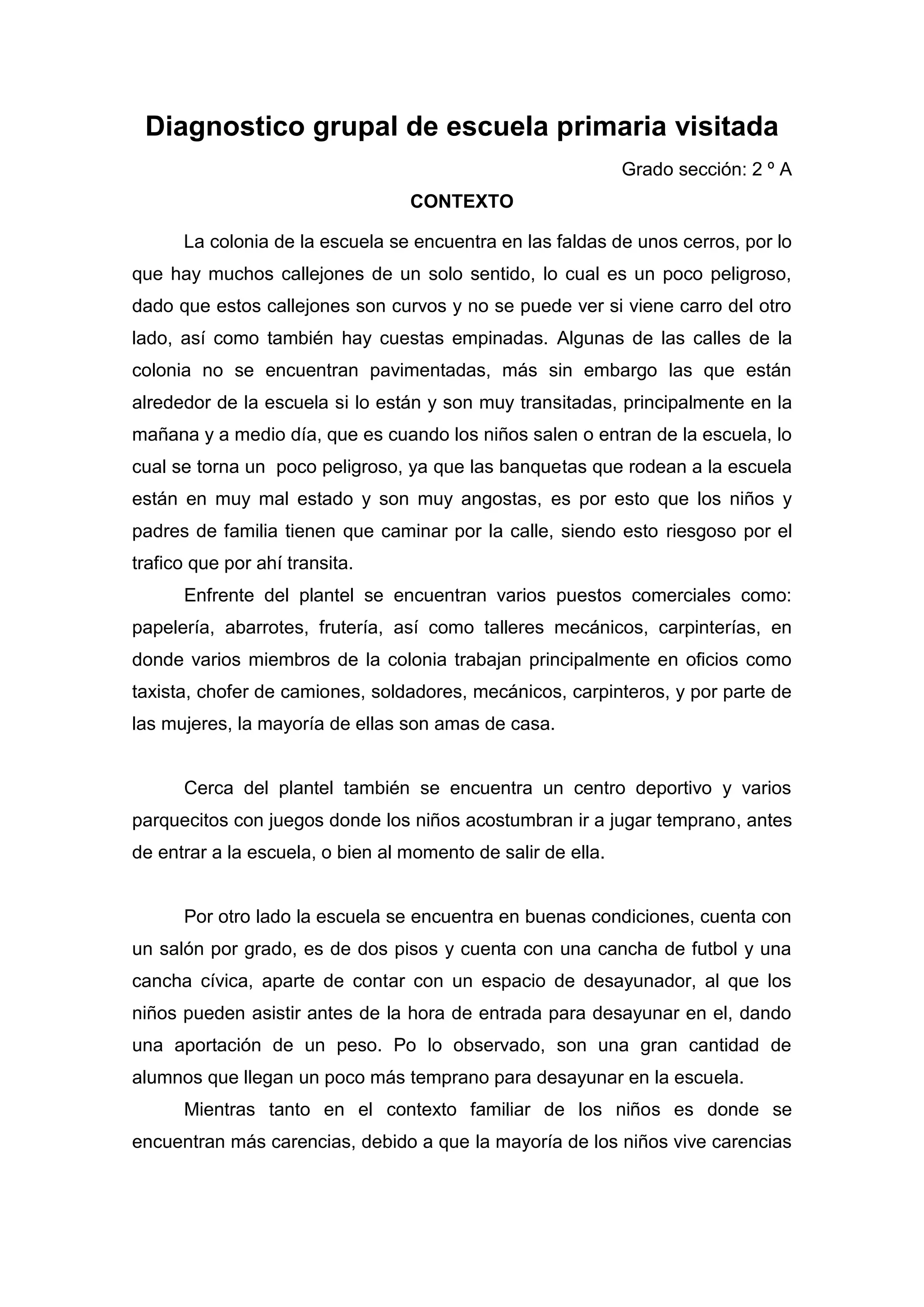 Este documento resume el diagnóstico grupal de un salón de segundo grado de primaria. La escuela se encuentra en una colonia con calles estrechas y poco pavimentadas, lo que representa riesgos para los estudiantes. La mayoría de los estudiantes viven en condiciones de pobreza y carecen de desayuno. Algunos estudiantes presentan problemas de conducta y aprendizaje relacionados con la desintegración familiar. El grupo es diverso en intereses, estilos de aprendizaje y niveles académicos. Se detectó