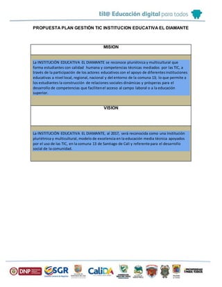 El documento presenta una propuesta de plan de gestión de las TIC para la Institución Educativa El Diamante. Incluye la misión, visión e identifica áreas de gestión como directiva, administrativa, académica y comunidad. Realiza un diagnóstico señalando fortalezas como disponibilidad al cambio y oportunidades como capacitaciones, pero también debilidades como bajo nivel en uso de TIC y amenazas como falta de conectividad. Propone dotar aulas TIC, asignar presupuesto, ajustar currículo a TIC