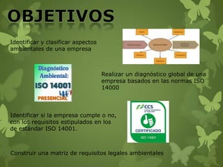 El documento presenta los hallazgos de un diagnóstico realizado a una empresa para evaluar su cumplimiento con los requisitos de la norma ISO 14001 sobre sistemas de gestión ambiental. Se analizan cada uno de los requisitos de la norma y se describe cómo la empresa los cumple, incluyendo que posee una política ambiental, ha identificado aspectos ambientales, cumple con requisitos legales, realiza auditorías internas y revisiones por la dirección.