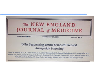 Este documento describe las técnicas de diagnóstico prenatal como biopsia de vellosidades coriales y ultrasonido, y discute cómo pueden llevar a tratamiento fetal, selección embrionaria o aborto. También analiza aspectos éticos como el propósito del diagnóstico prenatal, los beneficios y riesgos de no causar daño, y el dilema principal entre dar a luz un niño con una enfermedad severa o interrumpir el embarazo.