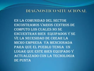 El documento presenta una propuesta para crear una microempresa de centro de computo en la comunidad de Pomasqui. Actualmente los centros de computo de la zona no están bien equipados y existe la necesidad de uno actualizado con tecnología de punta. El proyecto propone una excelente publicidad para dar a conocer el local y así pueda prosperar para beneficio de la comunidad. La empresa fue creada debido a la necesidad de la población de Pomasqui por un centro de computo que ofrezca todos los servicios requeridos y que actualmente faltan en otros
