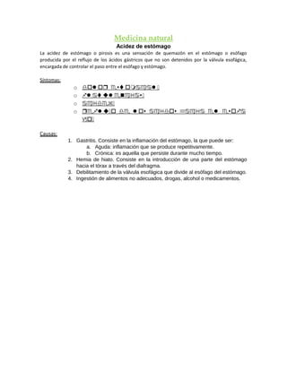 La acidez de estómago se produce por el reflujo de ácidos gástricos que no son detenidos por la válvula esofágica. Los síntomas incluyen dolor estomacal, regurgitación y acidez. Las causas principales son la gastritis, hernia de hiato y debilitamiento de la válvula esofágica. El tratamiento involucra el uso de plantas que neutralizan los ácidos, antiácidos, tratar las causas subyacentes y adoptar hábitos alimenticios saludables.