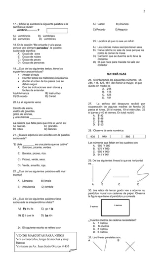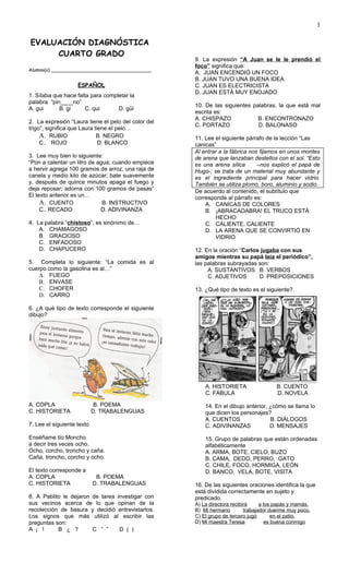Este documento contiene una evaluación diagnóstica de español y matemáticas para cuarto grado. Consiste en 30 preguntas de opción múltiple sobre temas como gramática, lectura, operaciones matemáticas básicas y geometría. El objetivo es evaluar los conocimientos y habilidades de los estudiantes en estas asignaturas.