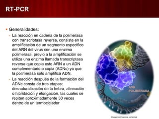 El documento describe dos técnicas de diagnóstico de Ebola: RT-PCR y ELISA. RT-PCR consiste en la amplificación de un segmento específico del ARN del virus mediante la transcripción reversa del ARN a ADN complementario, seguido de la replicación del ADN a través de múltiples ciclos de desnaturalización, alineamiento y elongación. ELISA detecta la presencia de antígenos o anticuerpos mediante la unión enzimática de un complejo anticuerpo-antígeno a una superficie, revelando la reacci