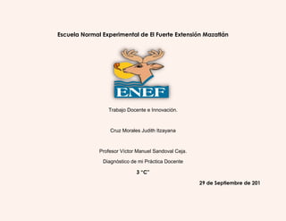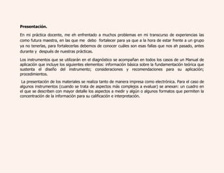 Este documento presenta el diagnóstico de la práctica docente de una maestra en formación. Describe los instrumentos que utilizará para la autoevaluación, incluyendo una guía de observación, cuadernos de los alumnos y listas de cotejo. También incluye secciones sobre los parámetros a analizar, los aspectos de la planeación docente, el uso de recursos, estrategias de enseñanza y evaluación. El objetivo es identificar fortalezas y áreas de oportunidad para mejorar su desempeño como futura maest
