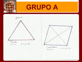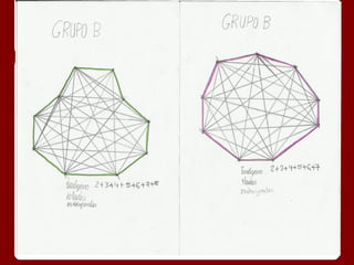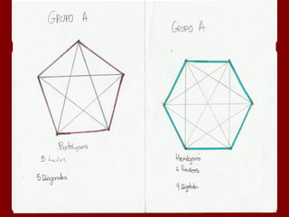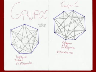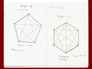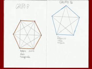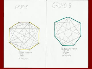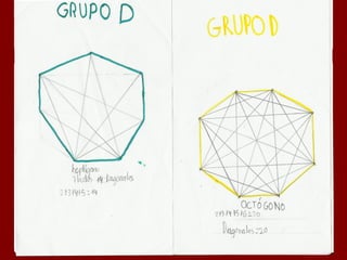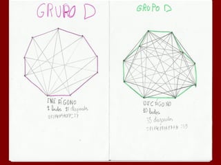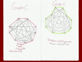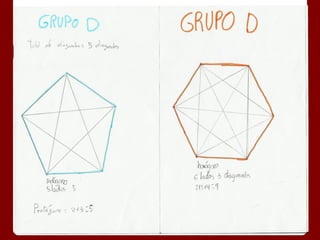 Este documento describe la fórmula para calcular el número de diagonales en un polígono de n lados. Explica que un polígono de 4 lados tiene 2 diagonales, uno de 5 lados tiene 5 diagonales, y uno de 6 lados tiene 9 diagonales. Además, proporciona una fórmula general para calcular el número de diagonales en un polígono de n lados como la suma de 2 + 3 + 4 + ... + (n-2).