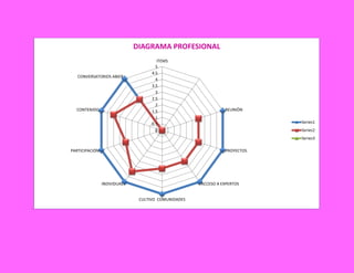 El documento presenta un diagrama con datos sobre diferentes categorías como reuniones, proyectos, acceso a expertos, cultivo de comunidades, participación individual, contenido y conversatorios abiertos. Los valores van de 0 a 5 en el eje Y para cada categoría en el eje X. El diagrama compara tres conjuntos de datos diferentes sobre estas categorías.