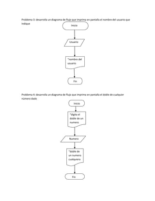 El documento presenta 6 problemas que piden desarrollar diagramas de flujo o algoritmos para realizar diferentes tareas como imprimir el nombre de usuario, imprimir el doble de un número, imprimir el nombre y grupo de usuario, e imprimir la suma de los cuadrados de dos números.