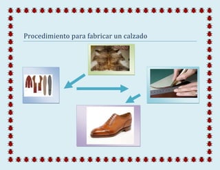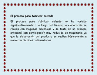 El proceso para fabricar calzado consiste en un proceso artesanal con participación reducida de maquinaria, ya que la elaboración del producto se realiza principalmente a mano con técnicas rudimentarias, a pesar de que se utilizan máquinas mecánicas. El proceso no ha variado significativamente a lo largo del tiempo.
