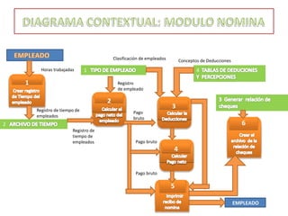 El documento describe el proceso de pago de nómina de una empresa. Registra las horas trabajadas por los empleados, calcula su pago bruto y deduce pagos para clasificar a los empleados y realizar pagos.