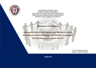 Este documento presenta un resumen de los antecedentes de un proyecto de trabajo de grado para una maestría en comunicación corporativa. El proyecto consiste en desarrollar un programa estratégico de comunicación corporativa para el mercadeo de la empresa regional Ciro Sánchez y Cía en el municipio de San Cristóbal, estado Táchira, Venezuela para el año 2013. Se incluyen referencias a investigaciones y proyectos previos relacionados con comunicación organizacional, aprendizaje organizacional, diseño de planes de comunicación integral y planes estratégicos emp