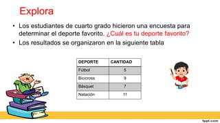 El documento describe una encuesta realizada por estudiantes de cuarto grado sobre sus deportes favoritos. Los resultados se organizaron en una tabla y luego se representaron gráficamente en un diagrama de barras, mostrando que la natación fue el deporte más popular con 11 votos y el fútbol el menos popular con 5 votos. El diagrama de barras es una forma clara y ordenada de representar información de una tabla.