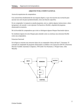 Este documento describe la arquitectura de un procesador de 32 bits típico. Consiste en las siguientes unidades funcionales: la unidad de control, la unidad aritmética lógica, los registros de trabajo, la memoria y la unidad de entrada/salida. La unidad de control sincroniza las operaciones mediante señales de reloj y decodifica las instrucciones. La unidad aritmética lógica realiza operaciones como sumas y restas. Los datos se almacenan en la memoria y se transfieren entre unidades a través de buses