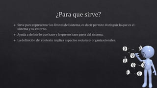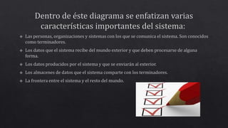 El diagrama de contexto incluye terminadores, flujos de datos, flujos de control, almacenes de datos y un único proceso. El proceso se nombra con el nombre del sistema o un acrónimo y representa la actividad que transforma datos. Las bases de datos interaccionan con el sistema, estableciendo relaciones unidireccionales y bidireccionales con el proceso.