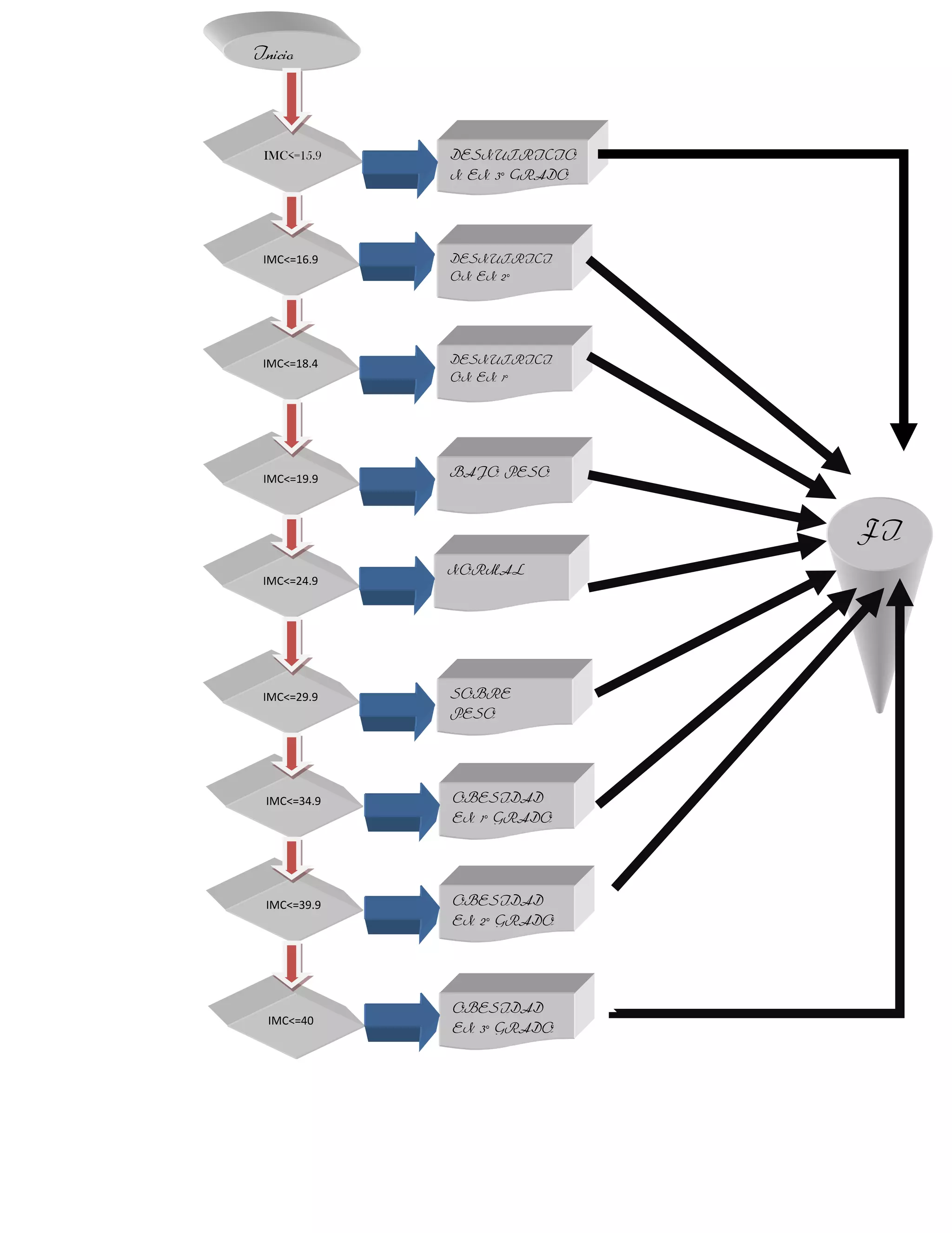 El documento clasifica el estado nutricional de una persona según su índice de masa corporal (IMC), dividiendo los rangos de IMC en desnutrición de 3er, 2do y 1er grado, bajo peso, normal, sobrepeso, obesidad de 1er, 2do y 3er grado.