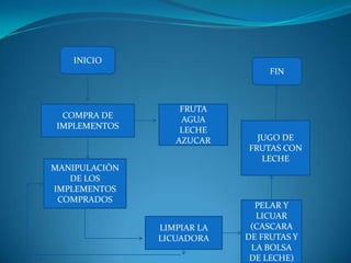 El diagrama de flujo describe el proceso de hacer jugo de frutas con leche realizado por dos estudiantes de 9o grado. El proceso incluye comprar frutas, agua, leche y azúcar, manipular los implementos comprados, pelar y licuar las frutas con la leche, y limpiar la licuadora y residuos.