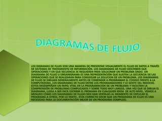 Los diagramas de flujo son una forma de representar visualmente el flujo de datos a través de sistemas de procesamiento de información. Describen las operaciones y la secuencia requeridas para resolver un problema. Los diagramas de flujo se dibujan generalmente antes de programar para facilitar la comprensión de problemas complejos y documentar programas. Ofrecen ventajas al explicar programas a otros.