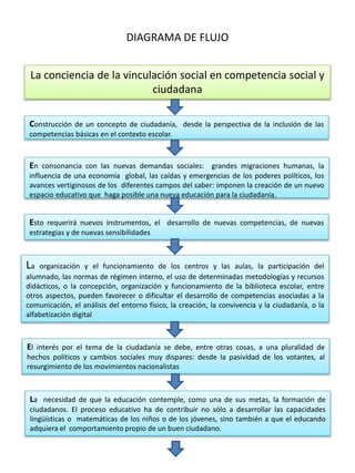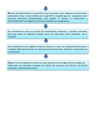 El documento describe la importancia de desarrollar competencias ciudadanas en el contexto escolar para hacer frente a los cambios sociales. Señala que se requieren nuevos enfoques educativos, instrumentos y estrategias para formar ciudadanos competentes que puedan participar de forma constructiva en la sociedad. Define la competencia cívica como el conjunto de conocimientos, habilidades y actitudes necesarias para que los individuos lleven una vida plena como miembros de la sociedad, incluyendo la capacidad de ponerse en el lugar del otro y aceptar las diferencias