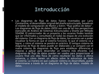 Este documento explica qué son los diagramas de flujo de datos y sus componentes. Define los diagramas de flujo de datos como una descripción gráfica de un procedimiento para resolver un problema usando figuras y flechas. Explica que los componentes principales son procesos, flujos, almacenes y terminadores. Además, provee ejemplos y reglas para la creación de diagramas de flujo de datos.