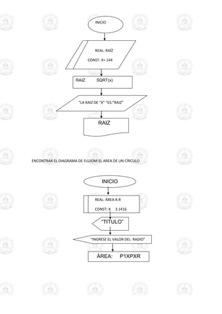 El documento presenta varios diagramas de flujo y algoritmos para resolver problemas matemáticos y de programación, incluyendo la suma de dos números, encontrar la raíz cuadrada de 144, calcular el área de un círculo, llenar una cubeta de 5 litros con exactamente 2 litros de agua usando otra cubeta de 4 litros, y resolver una ecuación cuadrática.