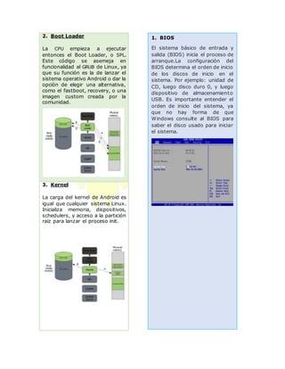 El documento describe los pasos del proceso de inicio de los sistemas operativos Windows y Android. En Windows, el BIOS inicia el proceso y carga el MBR y sector de inicio, los cuales contienen la información de particiones y cargador de inicio respectivamente. El cargador de inicio lee la configuración para iniciar la instalación de Windows correcta. En Android, cuando se enciende el dispositivo la CPU ejecuta el código de arranque para inicializar hardware y buscar la partición de arranque. Luego el bootloader carga el kernel de Android y el pro