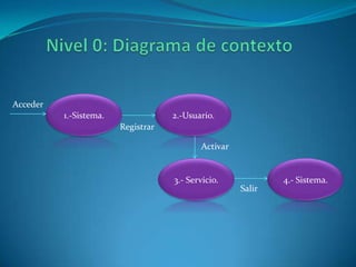 Este documento presenta un diagrama de flujo de datos de 4 niveles que describe el proceso de acceso, registro y activación de un sistema. A nivel 0, se muestra el contexto general del sistema y sus usuarios y servicios. Los niveles 1 y 2 incluyen diagramas superiores y de detalle que especifican las entradas de datos, acciones y componentes requeridos en cada etapa como introducir nombre, contraseña, número de teléfono, confirmar código de activación y cerrar sesión.