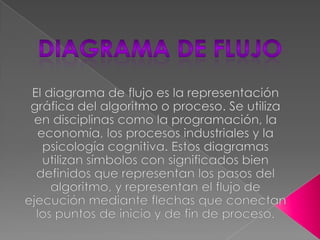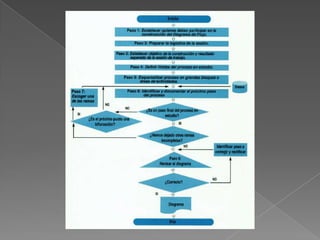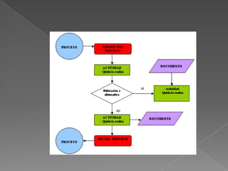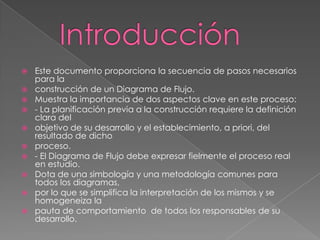 El documento describe los pasos para construir un diagrama de flujo, incluyendo definir el objetivo y límites del proceso, identificar las actividades y puntos de decisión, y construir el diagrama respetando la secuencia cronológica y usando la simbología adecuada. Se enfatiza la importancia de la planificación y participación de las partes interesadas.