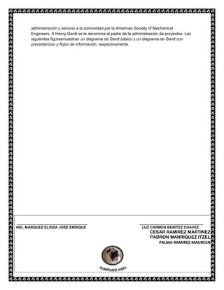 El documento describe el diagrama de Gantt, un gráfico de barras que ilustra un calendario de proyecto y muestra el estado de las actividades. Fue desarrollado originalmente por Karol Adamiecki en 1931, pero fue popularizado por Henry Gantt en 1910. En la década de 1980, las computadoras facilitaron la creación de diagramas de Gantt, y en la actualidad son una característica común de las aplicaciones en línea para la planificación de proyectos.
