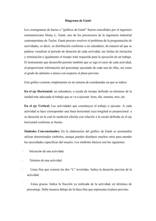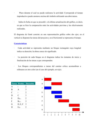 El diagrama de Gantt es una herramienta de planificación desarrollada por Henry Gantt que representa gráficamente las tareas de un proyecto en el eje vertical y el tiempo en el eje horizontal. Cada tarea se representa como un bloque rectangular cuya longitud indica su duración, permitiendo visualizar fechas de inicio y fin. Los diagramas de Gantt son útiles para proyectos simples, pero tienen limitaciones para proyectos complejos.