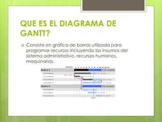 El diagrama de Gantt es una gráfica de barras utilizada para programar recursos y actividades de un proyecto. Fue desarrollado por Henry Gantt para ayudar a los gerentes a planificar y supervisar proyectos mediante la visualización de las tareas programadas y su progreso en el tiempo. El diagrama de Gantt muestra las actividades, responsables, fechas de inicio y fin para cada tarea con el fin de lograr los objetivos y la culminación del proyecto de manera ordenada.