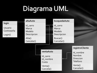 Este documento presenta un diagrama UML que modela las clases principales de un sistema de venta de autos. Las clases incluyen Login para iniciar sesión, altaAuto para agregar autos, busquedaAuto para buscar autos, registroCliente para registrar clientes y ventaAuto para vender autos. También incluye un diagrama de secuencia que muestra el flujo de uso entre las clases.