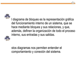 El diagrama de bloques representa gráficamente el funcionamiento interno de un sistema mediante bloques y sus relaciones, mostrando la organización del proceso, las entradas y salidas. Muestra el flujo de señales entre los bloques para indicar el camino de la información. Utiliza bloques, flujos y flechas para representar sistemas, variables de entrada y salida, y la dirección del flujo de información, respectivamente.