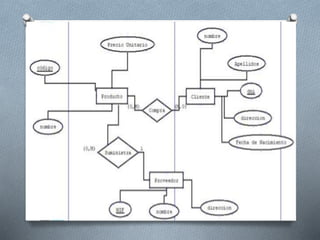 Una empresa vende productos a clientes y mantiene registros de los clientes, productos, y proveedores. Los clientes pueden comprar múltiples productos y los productos pueden ser comprados por múltiples clientes. Los productos son suministrados por proveedores, donde un producto solo puede ser suministrado por un proveedor. Se mantienen registros de los datos de contacto de los clientes, información del producto como nombre y precio, y datos de contacto de los proveedores.