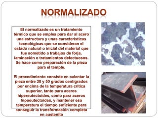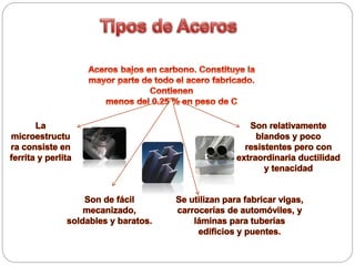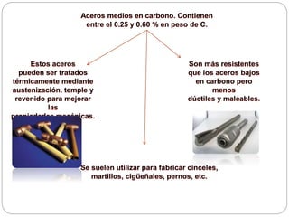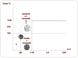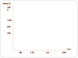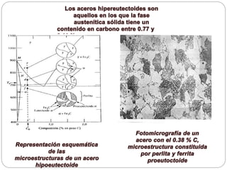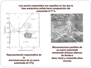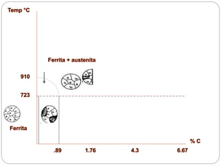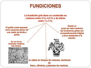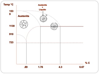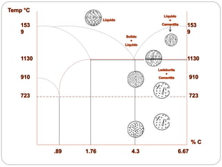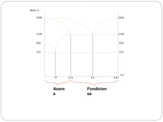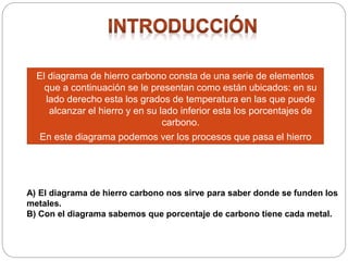 El diagrama de hierro-carbono muestra las diferentes fases del hierro en función de la temperatura y el porcentaje de carbono, incluyendo las soluciones sólidas α y γ, la cementita Fe3C, y la perlita. Se utiliza para determinar las propiedades de los aceros y fundiciones según su composición.