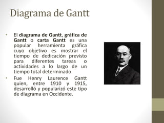 Este documento describe los diagramas de Gantt y barras, herramientas útiles para la planificación y gestión de proyectos. Explica que los diagramas de Gantt muestran las tareas de un proyecto a lo largo del tiempo y cuando se completarán, mientras que los diagramas de barras solo muestran la duración de cada tarea. También cubre conceptos clave como la ruta crítica, asignación de recursos, y dependencias entre tareas.