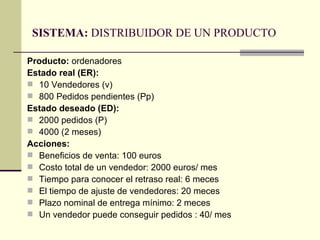 Este documento describe el proceso de aumentar las ventas de ordenadores de una empresa distribuidora a lo largo de 6 meses. La empresa comenzó con 10 vendedores y 800 pedidos pendientes. A través de incentivar a los vendedores, contratar más vendedores cada mes, y entregar pedidos pendientes, la empresa logró aumentar sus ventas a 2000 pedidos por mes, su objetivo deseado. Sin embargo, al sobrepasar su capacidad de entrega, la empresa experimentó un retraso de 6 meses en conocer el retraso real de entregas.